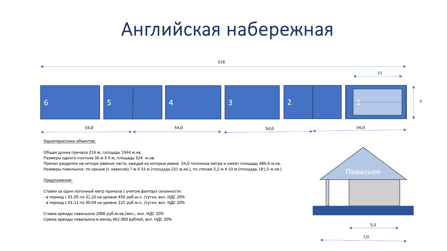 Каждый лот - одна часть причала длиной 54 погонных метра (причальная стенка). Начальная цена каждого лота: