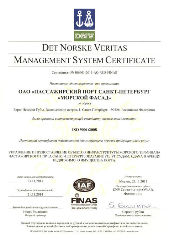 Пассажирский порт Санкт-Петербург успешно прошел сертификационный аудит системы менеджмента качества, соответствующей требованиям международного стандарта ISO 9001:2008. ISO 9001:2008 является международно-признанным стандартом, определяющим подход к Системе управления качеством организации.