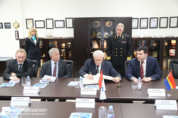 В завершении официального визита губернатор Санкт-Петербурга Георгий Полтавченко и губернатор Калининградской области Антон Алиханов оставили памятную запись в книге почетных гостей Пассажирского порта Санкт-Петербург.